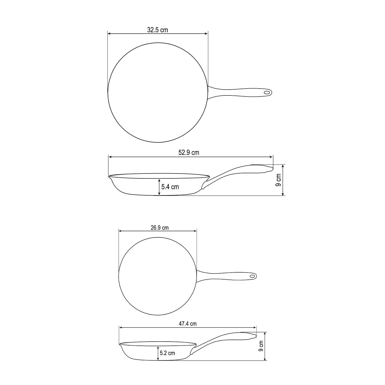 - 26cm frying pan (10in) (length with handle x width x height): 47.4cm x 26.9cm (26cm internal diameter) x 9cm